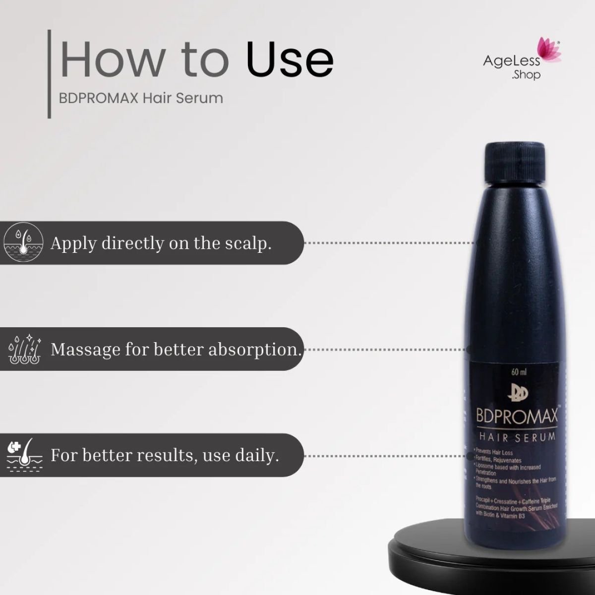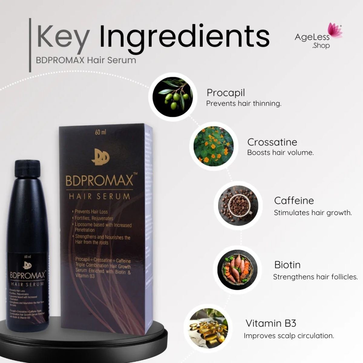 Product Description- Bdpromax Hair Serum is used for reducing hair fall by nourishing the scalp and strengthening hair follicles. The blend of key ingredients like Biotin and Niacinamide helps in eliminating hair loss. This serum helps support increased hair density and volume, leading to thicker and fuller hair. The blend of micronutrients in the serum supports hair growth and rejuvenation.