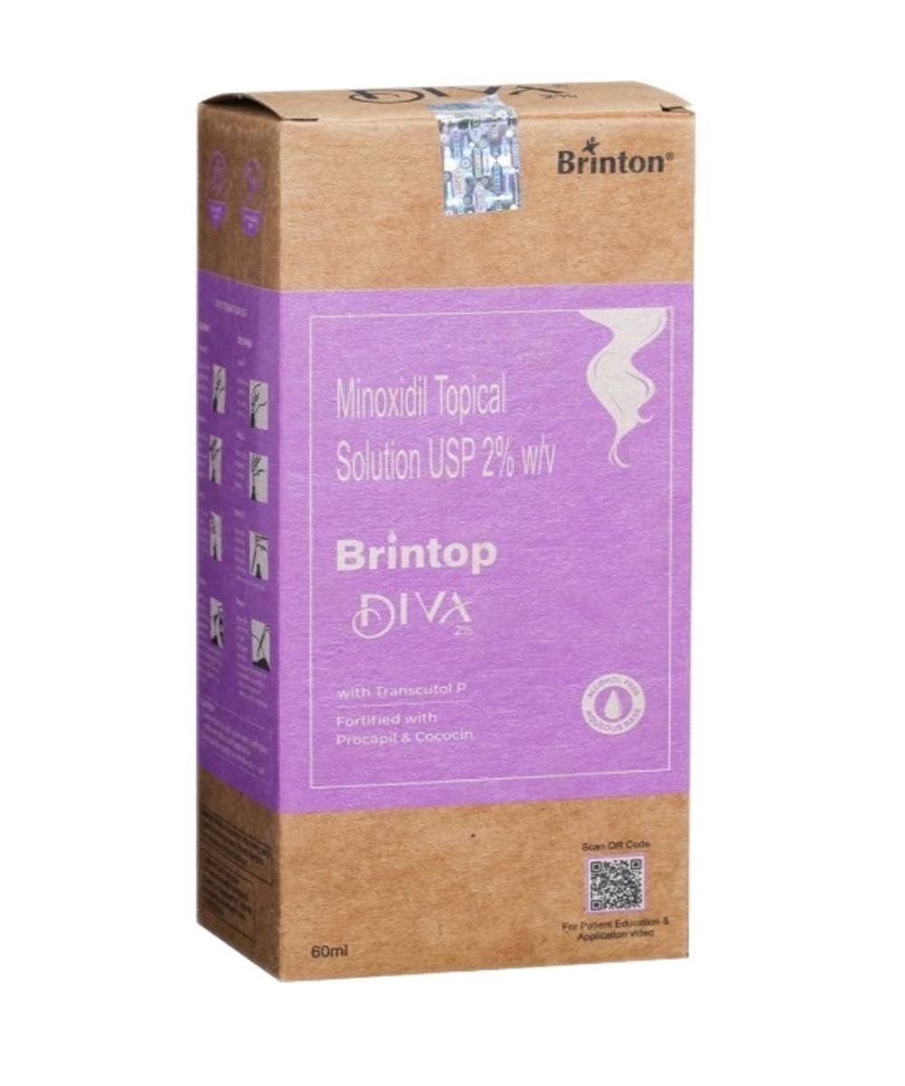 Product Description- Brintop Diva 2% Topical Solution belongs to a class of drugs known as vasodilators. It is used to promote hair growth in men with male pattern baldness by improving blood flow to hair follicles, helping slow hair loss, and encouraging new hair growth when used regularly.