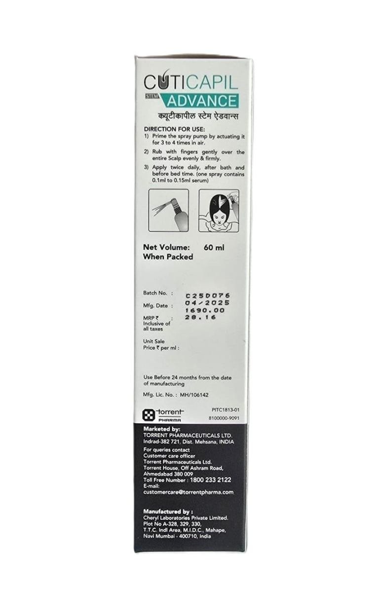 - Cuticapil Stem Advance Intensive Hair Serum is a specialized formula designed to combat hair loss and boost hair growth. Enriched with Procapil and Niacinamide, it strengthens hair follicles, nourishes the scalp, and improves hair density for a fuller, healthier look. This lightweight, non-greasy serum is easy to apply and works effectively to reduce hair fall and stimulate new hair growth. Ideal for all hair types, consistent use promotes thicker, shinier hair and a balanced, revitalized scalp.