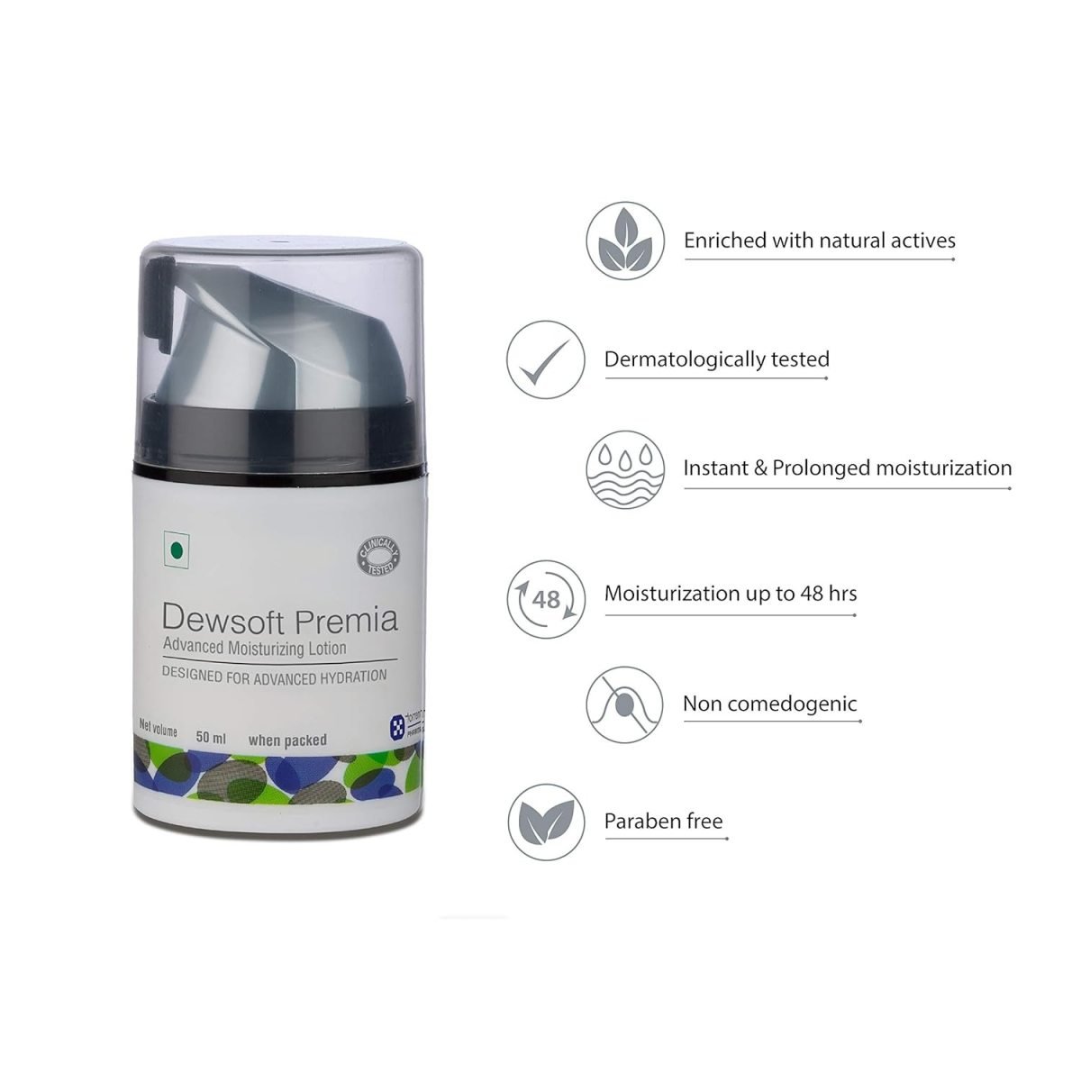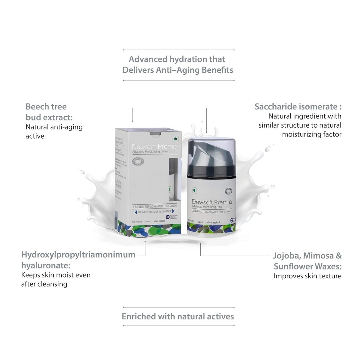 Product Description- Dewsoft Premia Advanced Moisturizing Lotion is a moisturizing lotion designed for advanced hydration of the skin. Active ingredients include Aloe Vera, Aqueous Extract Of Beech Tree bud Saccharide Isomerate, Aqua, Citric Acid, Sodium Citrate, Honey, Wheat Germ Oil, Tea Tree Oil.