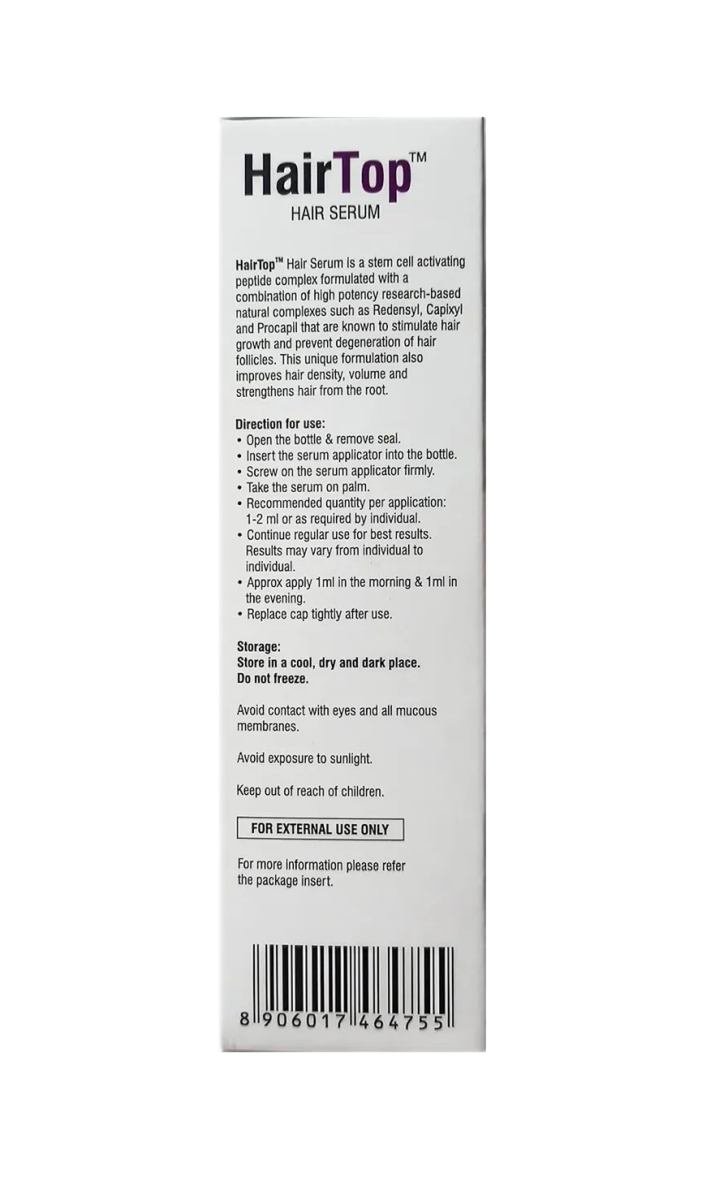 Product Description- Hairtop Hair Serum is used for supporting hair growth and promoting hair density. It is formulated with a unique blend of stem cell-activating peptides and research-based ingredients such as Redensyl, Capry, and Procap. These compounds may assist in stimulating hair follicle activity and slowing down the ageing process of hair roots.