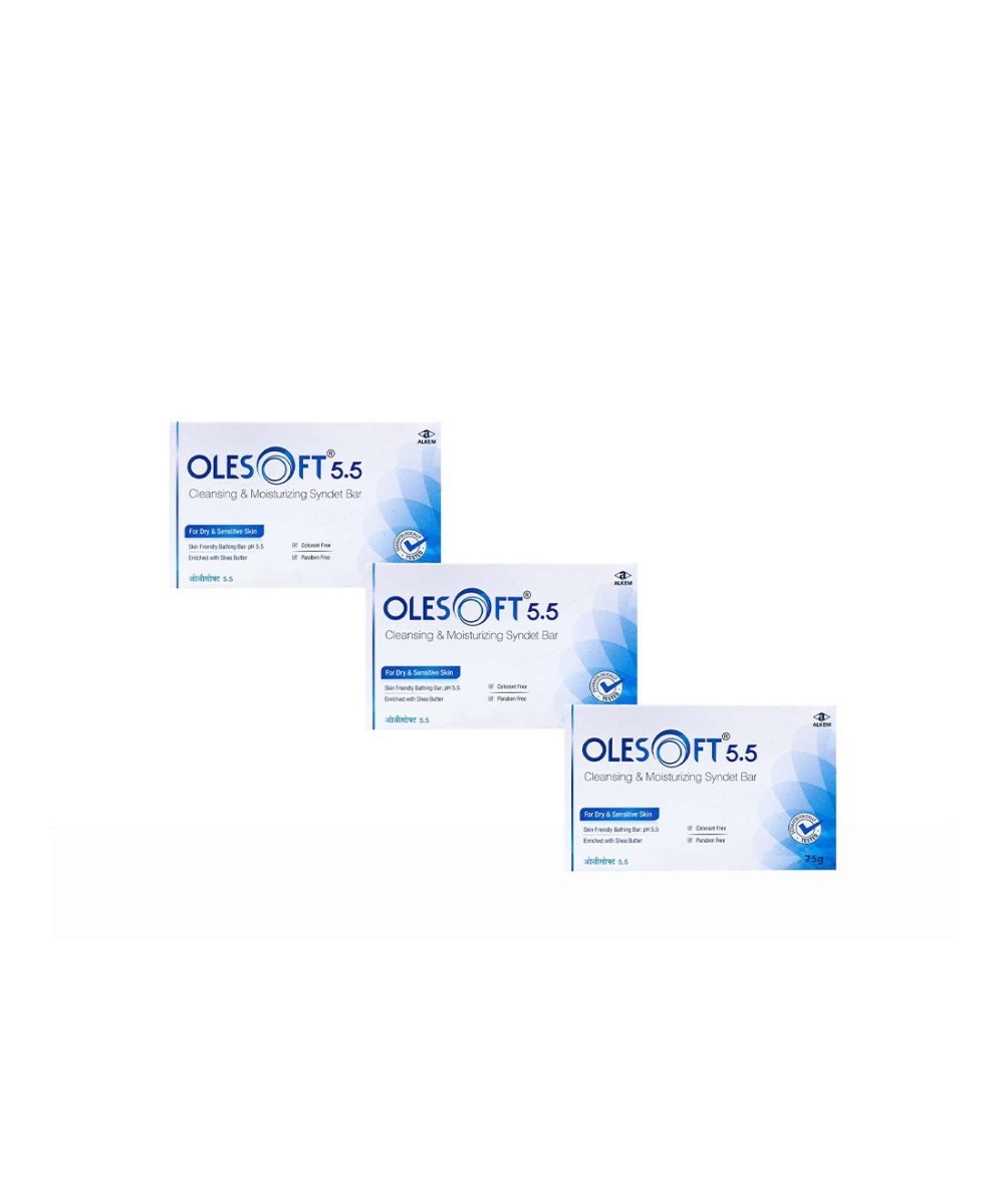 Product Description- Olesoft pH 5.5 Soap is used for gentle cleansing and maintaining skin hydration while preserving the skin's natural pH balance. It is formulated with a syndet base and key ingredients such as Glycerine, Olive Oil and Shea Butter. This soap provides a moisturising effect, helps soothe dry and sensitive skin and supports a healthy, youthful appearance. Glycerine helps retain the skin's natural moisture, while Olive Oil and Shea Butter offer additional hydration and improve skin texture. Ideal for daily use, it promotes softness and suppleness, making it suitable for all skin types.