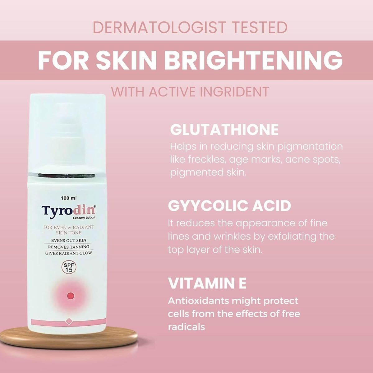 Product Description- Tyrodin Creamy Lotion/For Even & Radiant Skin Tone /SPF 15 can help manage even and glowing skin tone with SPF 15. It is suitable for all skin types, making it suitable for daily use.